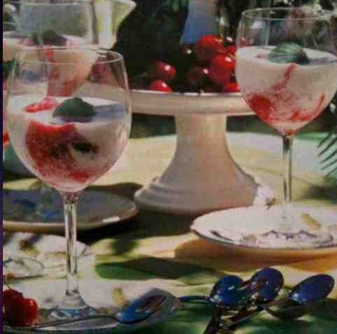 Disponete il dolce così ottenuto in un contenitore di vetro e riponetelo in frigorifero per almeno 8 ore. Per servirlo, versatene 2-3 cucchiai per bicchiere (o coppetta a seconda dei gusti) , guarnitelo con le amarene sciroppate a piacere e servitelo subito con una fogliolina di menta.