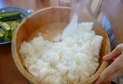 Preparate la salsa di aceto di riso: mescolate l’aceto, lo zucchero ed il sale per bene. Trasferite il riso in una ciotola di legno ed incorporatevi accuratamente la salsa di aceto, mescolando con il cucchiaio di legno. Quando il condimento si è amalgamato uniformemente il riso è pronto.