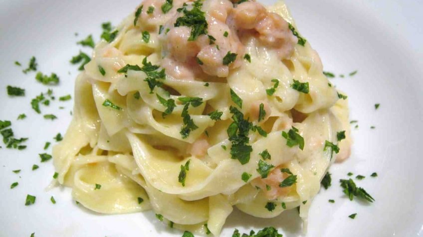 Deixar derreter a manteiga numa panela. Acrescentar o salmnao cortado em tirinhas e deixar dourar por 2-3 min em fogo médio. Unir o creme de leite. Misturar e deixar cozinhar em fogo vivo por 1 minuto. Apagar o fogo e ver se está bom de sal. Enquanto isso cozinhe e escorra o macarrão. coloque-o na panela do creme, esquente por 1 minuto mexendo e está pronto para servir imediatamente, com um pouco de queijo ralado por cima.