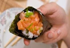 3- – é importante dispôr o salmão do meio até a ponta de forma que fique bem visível no lado mais aberto do cone e que ao comer o temaki tenha bastante recheio.
