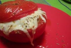Entretanto coloque os tomates num pirex untado com um pouco de azeite. Polvilhe-os com um pouco de sal, azeite e oregãos e recheie-os cuidadosamente com o preparado de atum. Sobre cada tomate coloque então o queijo ralado e cubra com a tampa.