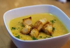 Tagliate il pane a dadini e tostatelo in forno. Versate la zuppa in una zuppiera e servitela con il pane tostato, il prezzemolo tritato e un filo di olio.