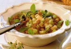 Schiacciate l’aglio rimanente, poi pelate e schiacciate l’aglio messo da parte. Unitelo alle verdure con il resto dell’olio, il concentrato di pomodori e le lenticchie. Mescolate, poi unite il brodo, le erbette fresche e aggiustate di sale e pepe. Portate a bollore mescolando. Lasciate sobbollire per 30 minuti, mescolando di tanto in tanto.