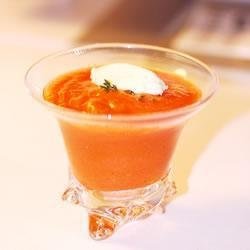 Servire la zuppa fredda in piccole scodelle o tazze grandi. Al momento di portare a tavola, fare palline di gelato di formaggio e mettere sopra ogni porzione.