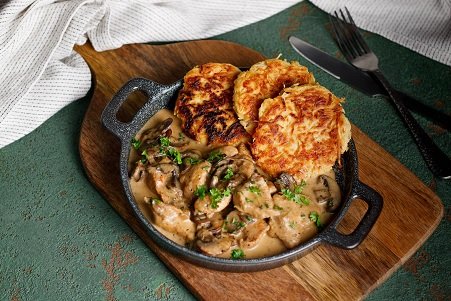 Zücher Geschnetzeltes pode ser traduzido como “carne em tiras à moda de Zurique”. Em geral, é servida com batata rosti, que você encontra aqui no Le Chef !